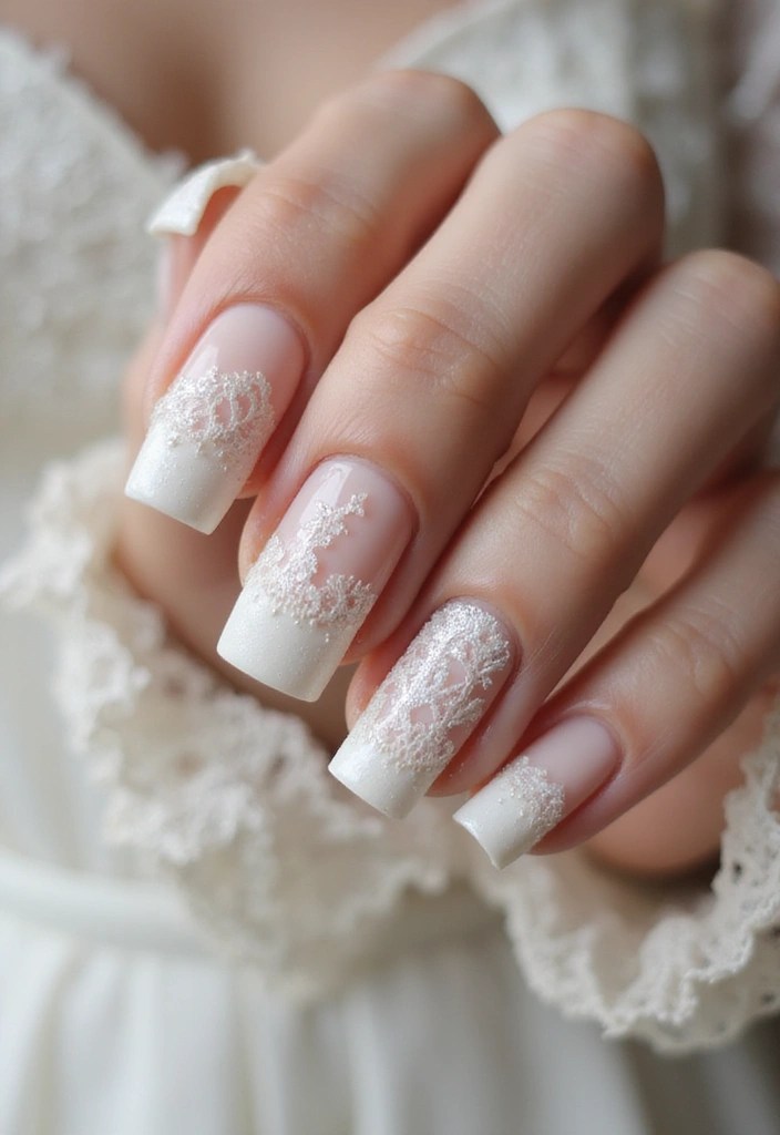 Vintage lace nail art channels a romantic and timeless aesthetic, perfect for a classic wedding.