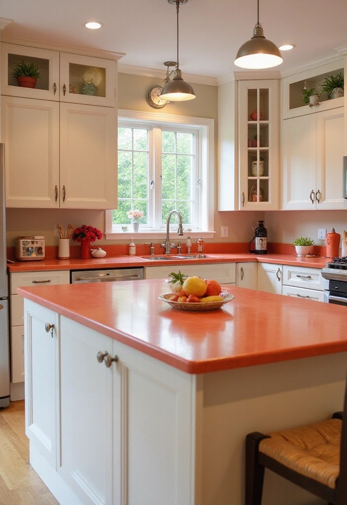Warm Coral Solid Surface countertops add a touch of playful elegance to your kitchen.