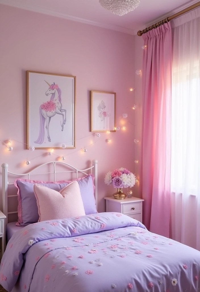 To enhance the whimsical atmosphere, incorporate a lovely unicorn bedding set and some enchanting wall art featuring magical creatures.