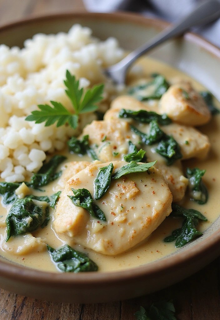 Indulge in the comforting flavors of creamy garlic chicken and spinach that will warm your heart and satisfy your cravings.